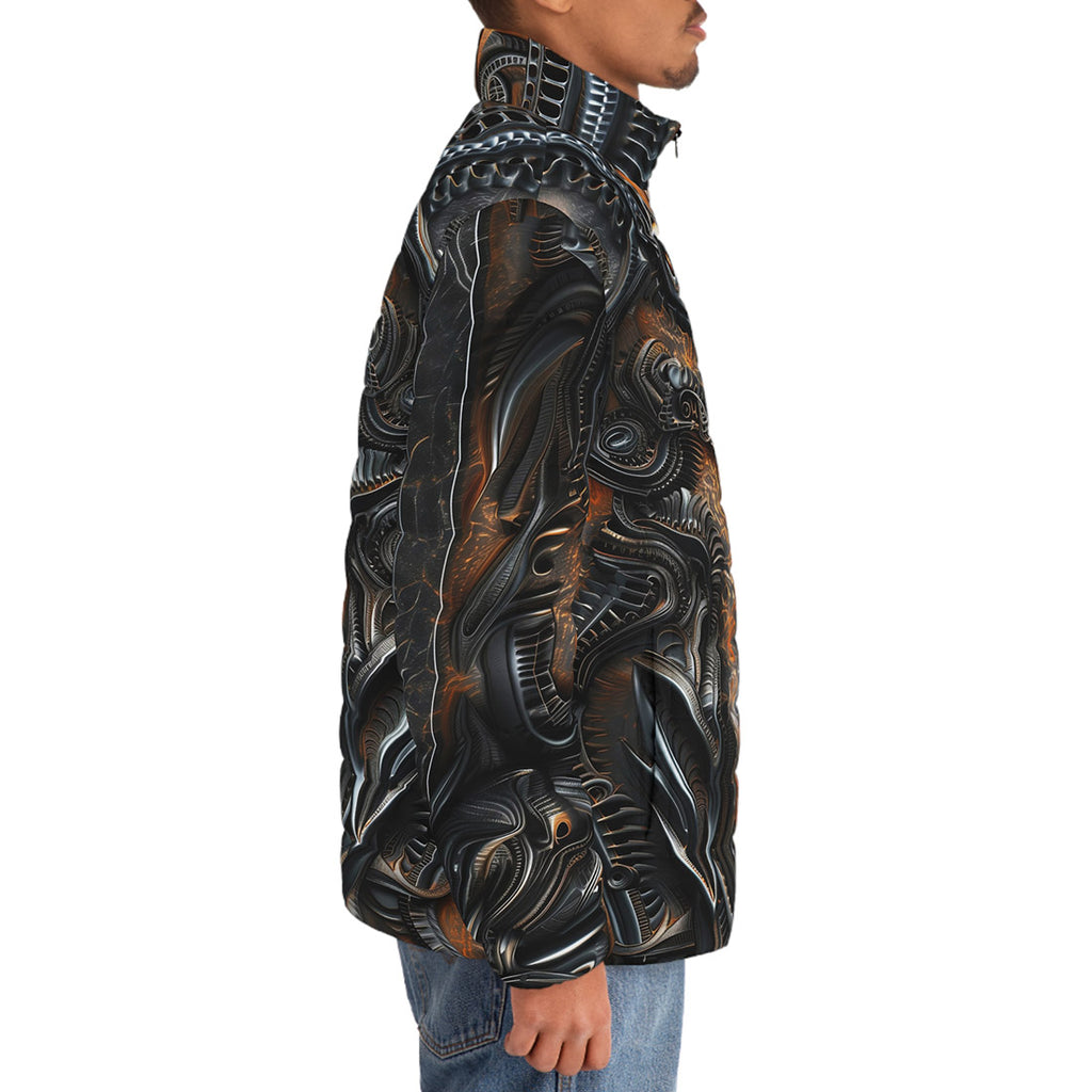 Down-Padded Puffer Jacket Mystical Carved Wooden Art
